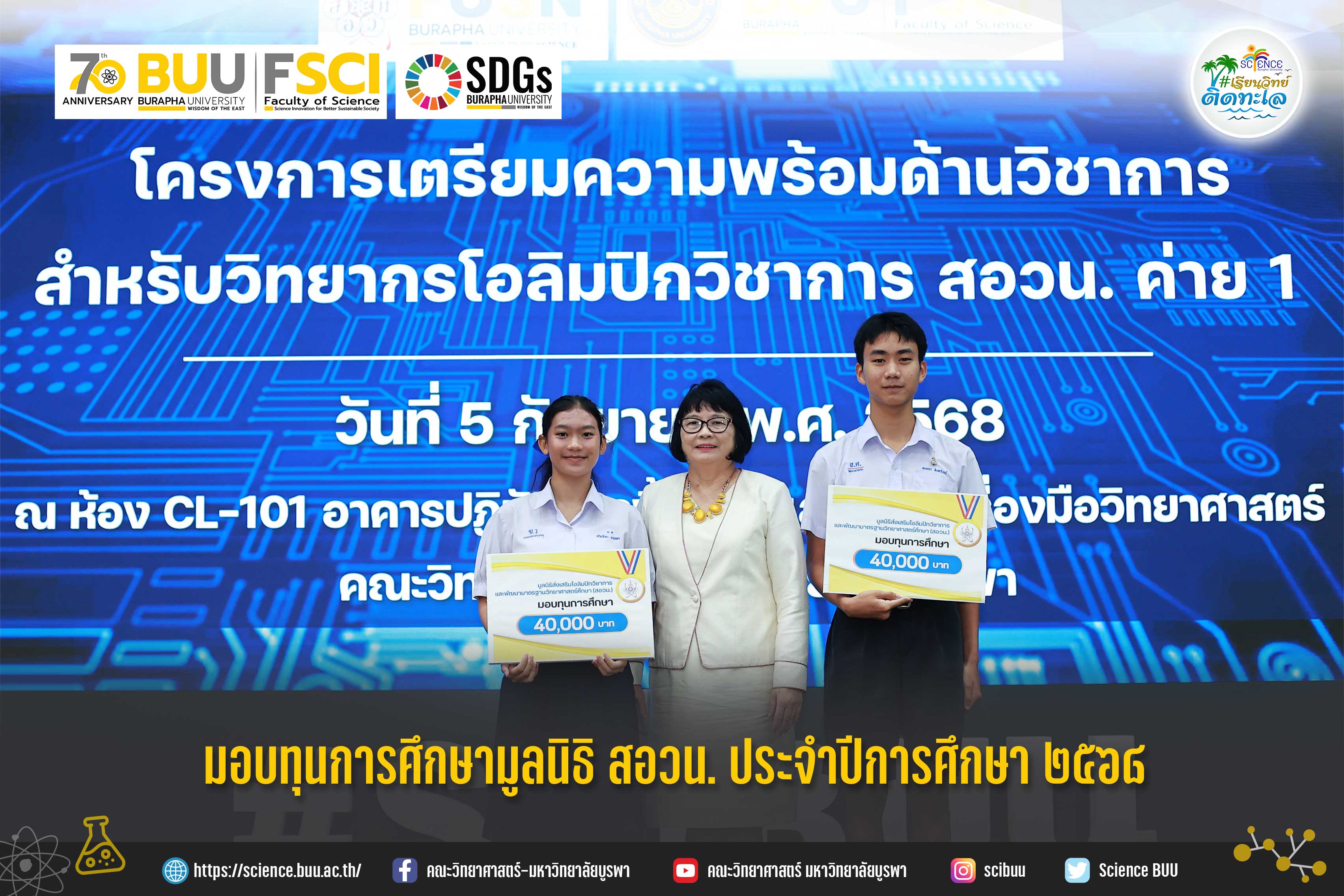 🎉 นักเรียนจากศูนย์โอลิมปิกวิชาการ สอวน. มหาวิทยาลัยบูรพา ที่ผ่านการอบรมค่าย ๒ สาขาดาราศาสตร์ ในโอกาสได้รับทุนการศึกษาจากมูลนิธิส่งเสริมโอลิมปิกวิชาการและพัฒนามาตรฐานวิทยาศาสตร์ศึกษา ในพระอุปถัมภ์สมเด็จพระเจ้าพี่นางเธอ เจ้าฟ้ากัลยาณิวัฒนา กรมหลวงนราธิวาสราชนครินทร์ (สอวน.) “ทุนการศึกษามูลนิธิ สอวน.” ประจำปีการศึกษา ๒๕๖๘ จำนวนเงิน ๔๐,๐๐๐ บาท (สี่หมื่นบาทถ้วน)