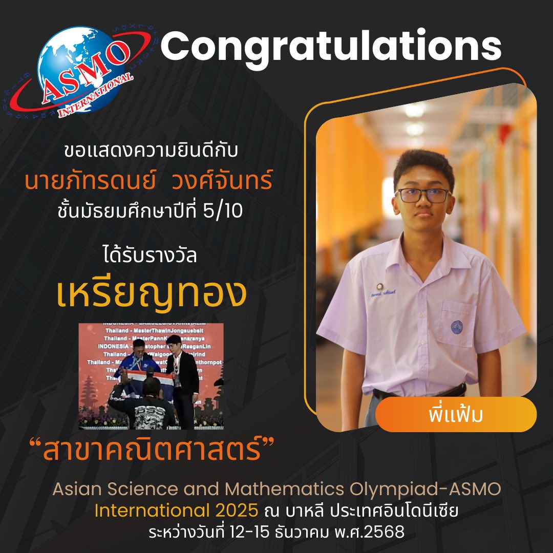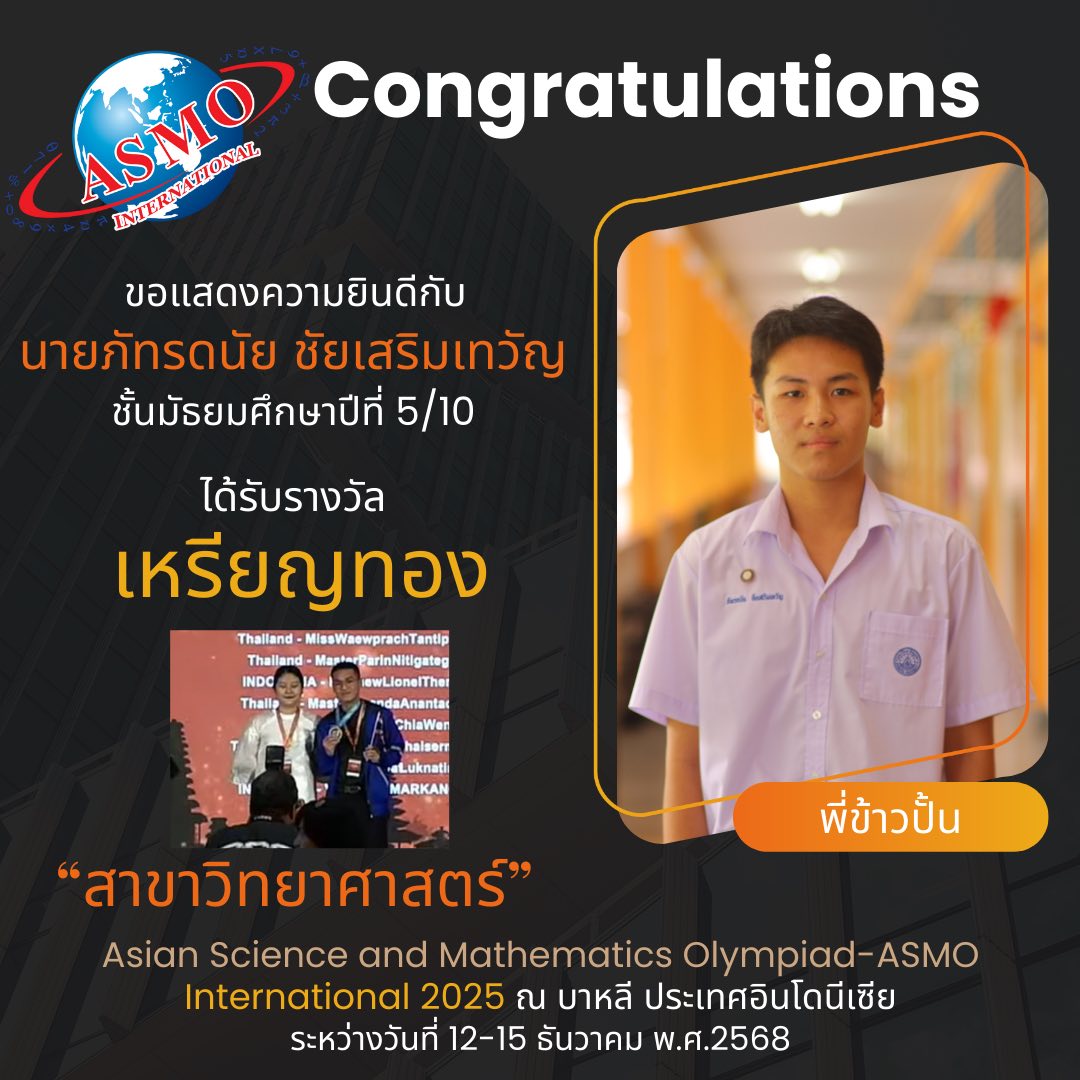 ขอแสดงความยินดีกับนักเรียนโครงการ วมว. ทั้ง 2 คน ที่ได้รับการคัดเลือกเป็นตัวแทนประเทศไทยในการแข่งขันระดับนานาชาติ ในการแข่งขัน Asian Science and Mathematics Olympiad-ASMO International 2025 ระหว่างวันที่ 12-15 ธันวาคม พ.ศ. 2568 ณ บาหลี ประเทศอินโดนีเซีย และได้รับรางวัล ดังนี้